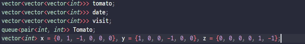 vector<int> x = { 0, 1, -1, 0, 0, 0 }, y = { 1, 0, 0, -1, 0, 0 }, z = { 0, 0, 0, 0, 1, -1 };