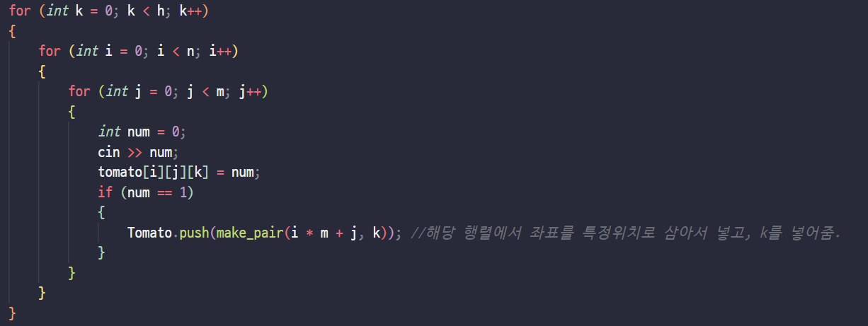 Tomato.push(make_pair(i * m + j, k)); //해당 행렬에서 좌표를 특정위치로 삼아서 넣고, k를 넣어줌.