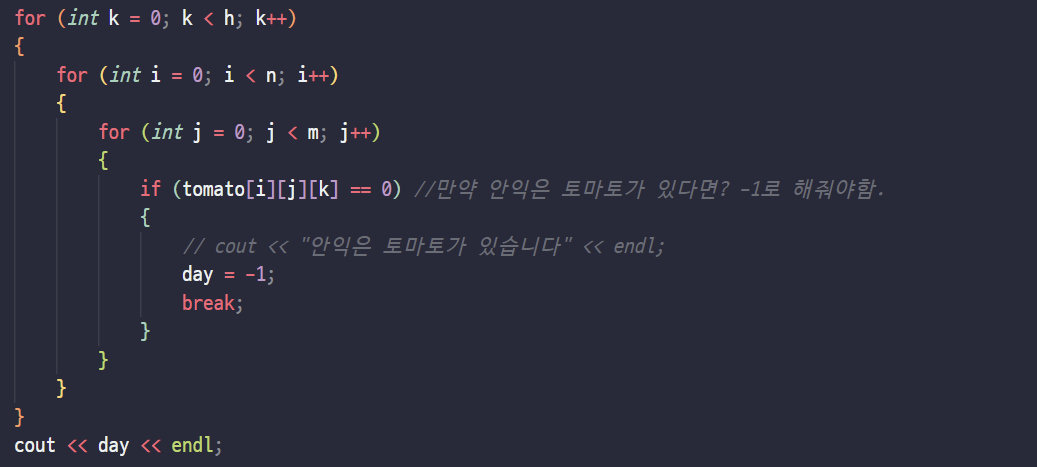 if (tomato[i][j][k] == 0) //만약 안익은 토마토가 있다면? -1로 해줘야함.