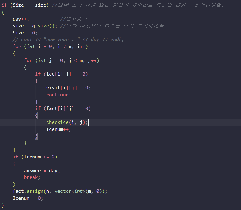 if (Size == size) //만약 초기 큐에 있는 빙산의 개수만큼 뺏다면 년차가 바뀌어야함.
