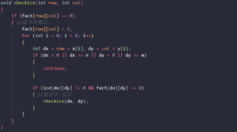 - row, col을 기준으로 4가지 방향을 탐색하는데 움직인 좌표가 빙하고, 아직 밟지 않은 곳이라면 재귀 문으로 이동한 좌표를 다시 실행한다.
