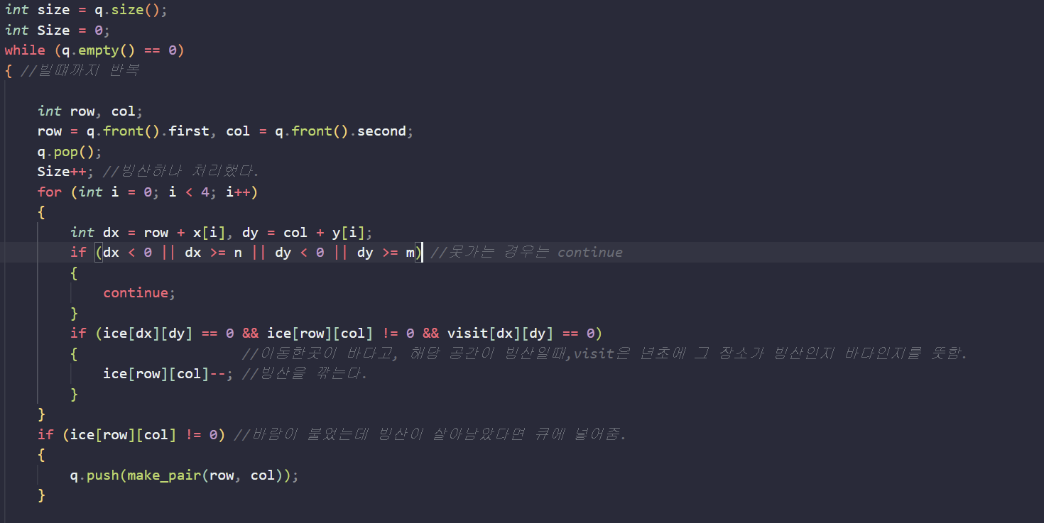 - 4가지 방향으로 이동한 뒤 만약 빙산이 사라지지 않고 남아있다면 다시 큐에 좌표를 푸시한다.