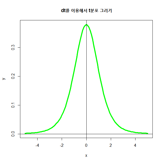 plot(x,y,type="l",col="green",lwd=4,main="dt를 이용해서 t분포 그리기");abline(v=0,h=0)
