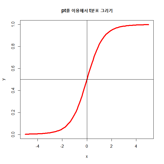 plot(x,y,type="l",col="red",lwd=4,main="pt를 이용해서 t분포 그리기");abline(v=0,h=0.5)