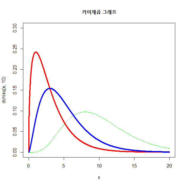 curve(dchisq(x,10),xlim=c(0,20),type="l",col="green",ylim=c(0,0.3),main="카이제곱 그래프")
