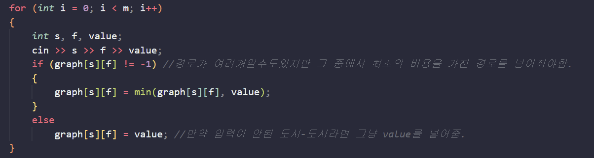 if (graph[s][f] != -1) //경로가 여러개일수도있지만 그 중에서 최소의 비용을 가진 경로를 넣어줘야함.