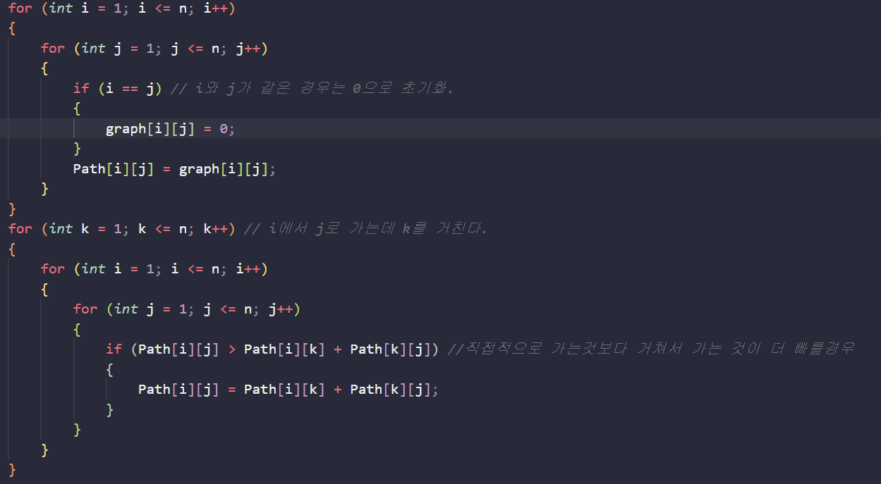 for (int k = 1; k <= n; k++) // i에서 j로 가는데 k를 거친다.