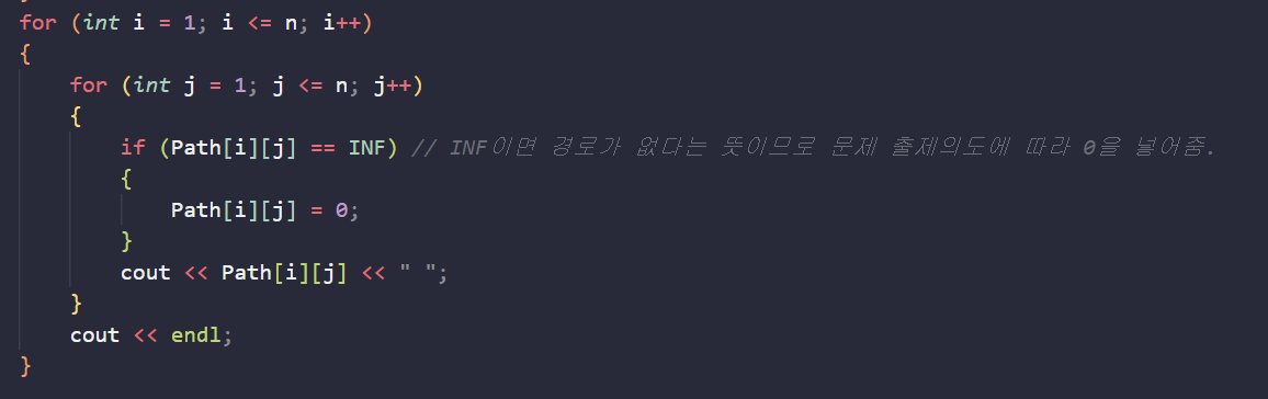 if (Path[i][j] == INF) // INF이면 경로가 없다는 뜻이므로 문제 출제의도에 따라 0을 넣어줌.