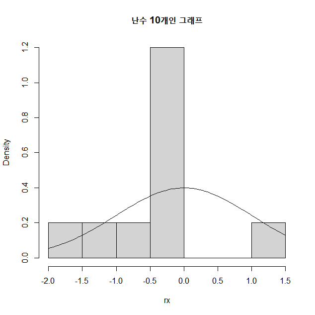 hist(rx,probability=T,main="난수 10개인 그래프")
