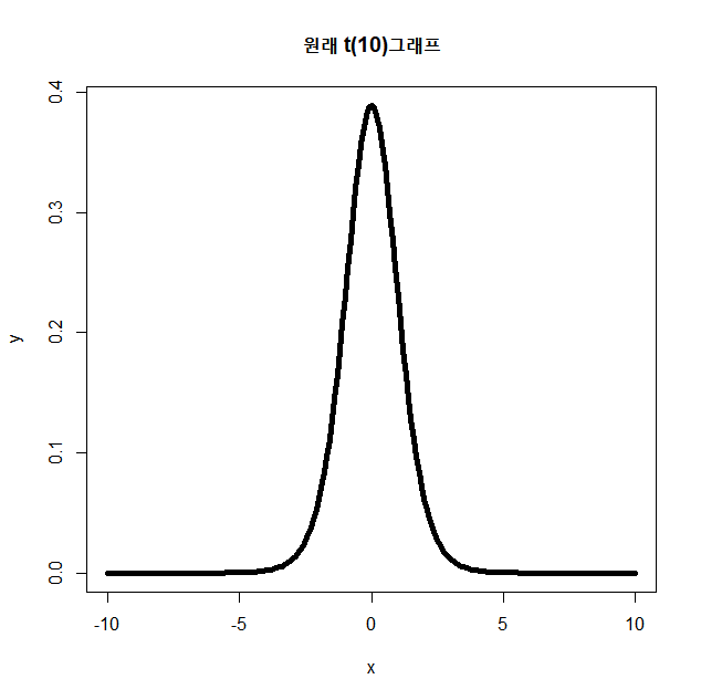 plot(x,y,type="l",col="black",lwd=5,main="원래 t(10)그래프")