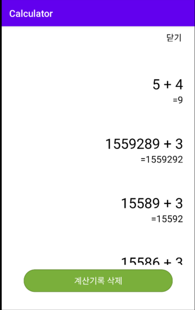 계산기록 버튼을 누르면 gone으로 선언된 레이아웃이 보이게끔 만들어줬고, historyLinearLayout 아래에 있는 view를 모두 지웠다.(기존 계산기 버튼 화면을 지우고 새 레이아웃만 보이게 했음.)