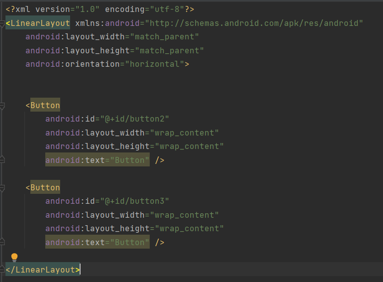 위 코드는 LinearLayout에 오리엔테이션을 "horizantal"로 줘서 버튼을 가로로 나열했습니다.