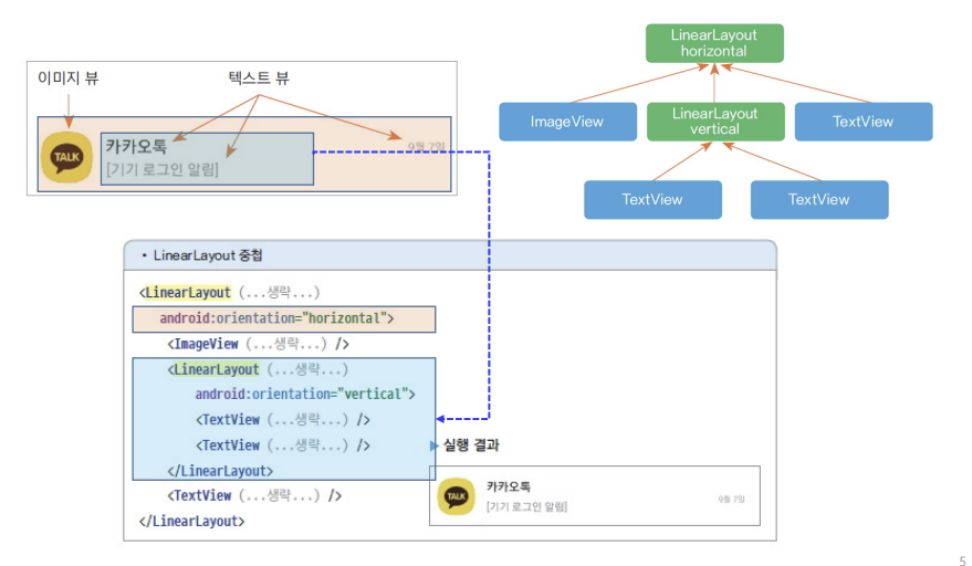 - 레이아웃 클래스도 View이므로 다른 레이아웃 클래스에 포함할 수 있음.