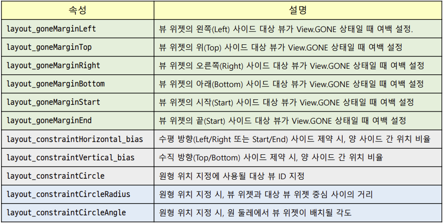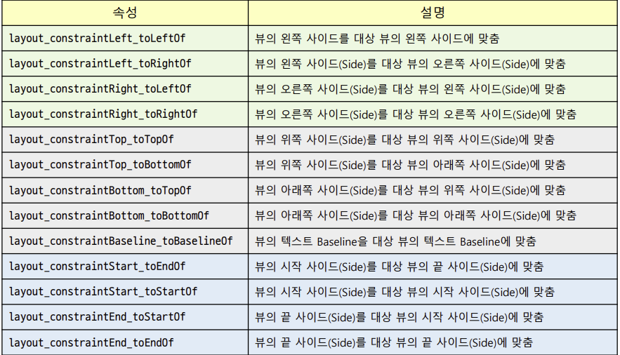 - 상대 위치로 배치하는 RelativeLayout과 비슷하지만 더 많은 속성을 제공