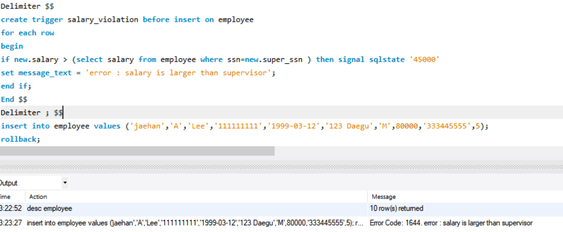 jaehan의 월급은 80000이고 상사의 월급은 30000이라 insert 전에 trigger가 검사를 해서 insert를 거부했다.
