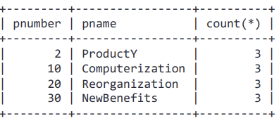 각 프로젝트 별로 참여하는 직원이 3명 이상인 프로젝트들에 대해서 pnumber, pname, 참여 직원 수를 구해라!