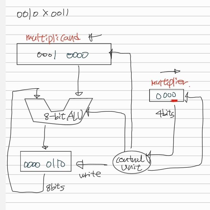 - multiplier의 LSB가 1이라면 multiplicand를 더한다.