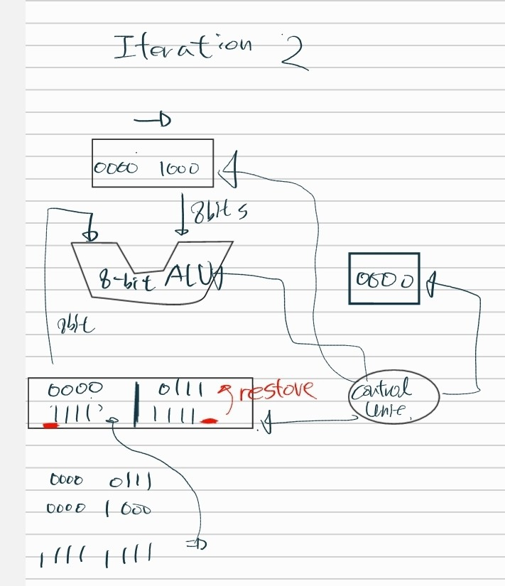 - sign bit가 1이라면 restroe 하고, 리마인더 레지스터를 왼쪽으로 shift 한다.