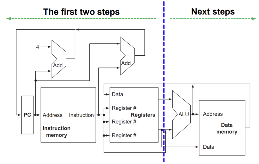 - data path는 PC, adder, ALU, instruction and data memory and registers를 포함한다.
