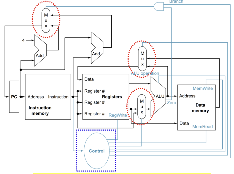- RISC - V 실행은 3가지 multiplexers와 컨트롤 유닛을 포함한다.