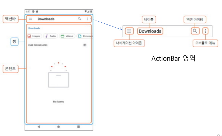 - 내비게이션 아이콘, 액션 아이템, 오버플로 메뉴 등 출력