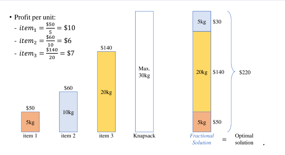 탐욕적으로 접근한다면 단위무게가 많은 5kg를 담고 그 다음 순서인 20kg를 담게 된다. 그 다음 10kg를 선택하지만 가방의 남은 무게가 10kg보다 적어 가방에는 10kg의 보석을 담지 못한다.
