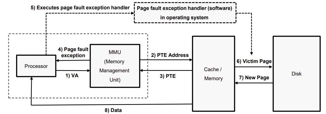 - handler는 새로운 페이지를 디스크로부터 받고, cache에 작성한 뒤, PTE를 수정한다.