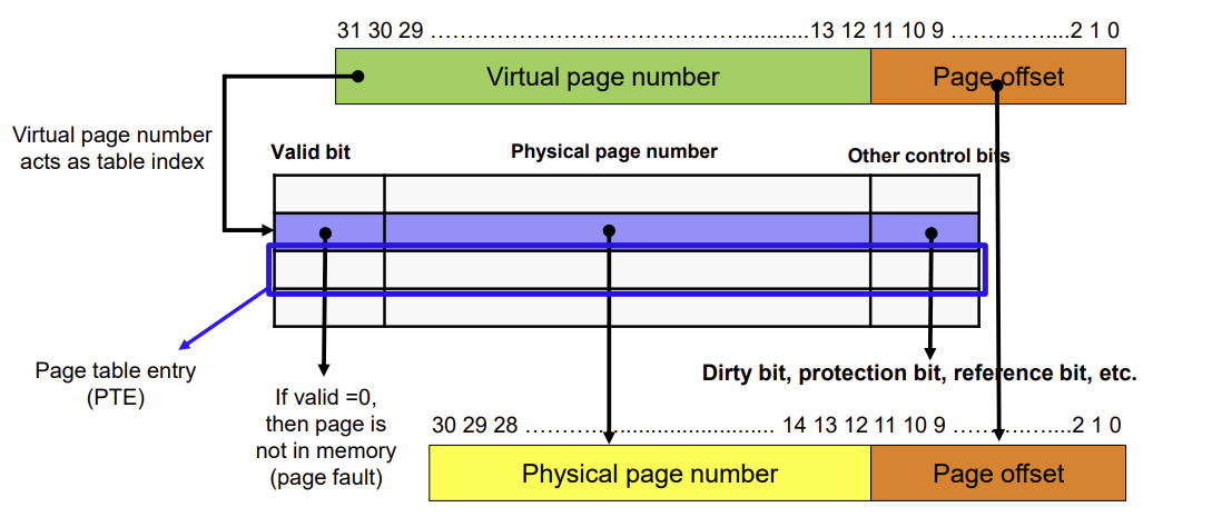 - valid bit가 1인 경우 page는 memory에 존재하고, page table은 physical page number를 포함한다.
