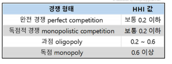 - 특정 산업에서 기업의 시장 점유율의 집중 정도를 계산하는 지표