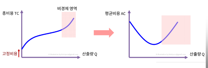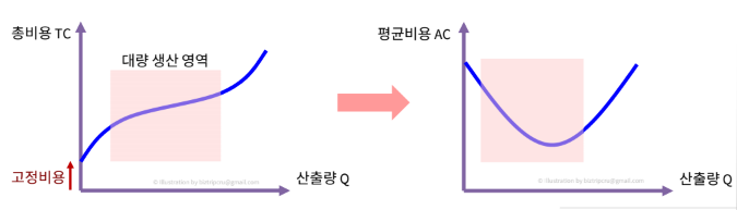 - 생산량을 증가시킴에 따라, 평균 비용 Average Cost이 감소하는 현상