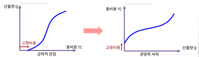 - 실제 관찰 결과, 직선이 아니고, 곡선으로 나옴 -> 총 비용 곡선