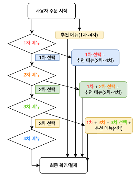 - 기획했던 추천메뉴의 기능은 각 단계마다의 최선의 선택지를 제공하는 기능으로 할려고 했습니다.