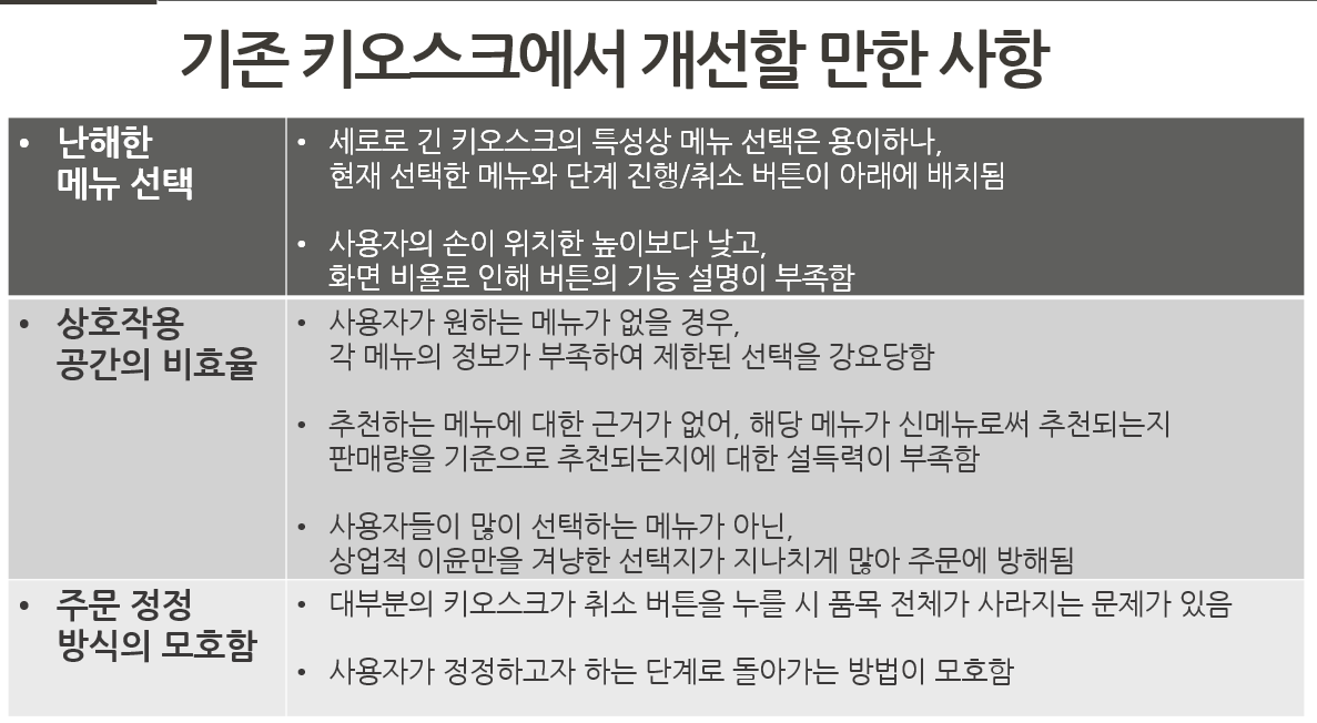 - 그래서 저희 팀은 기존 형태(세로)인 키오스크의 형태를 가로로 개선하고자 했습니다.