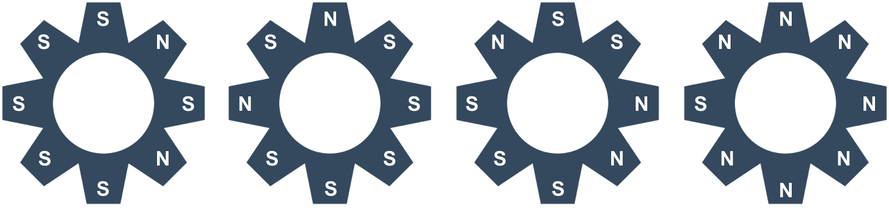 위와 같은 상태에서 1번 톱니바퀴를 시계 방향으로 회전시키면, 2번 톱니바퀴가 반시계 방향으로 회전하게 되고, 2번이 회전하기 때문에, 3번도 동시에 시계 방향으로 회전하게 된다. 4번은 3번이 회전하지만, 맞닿은 극이 같기 때문에 회전하지 않는다. 따라서, 아래와 같은 상태가 된다.