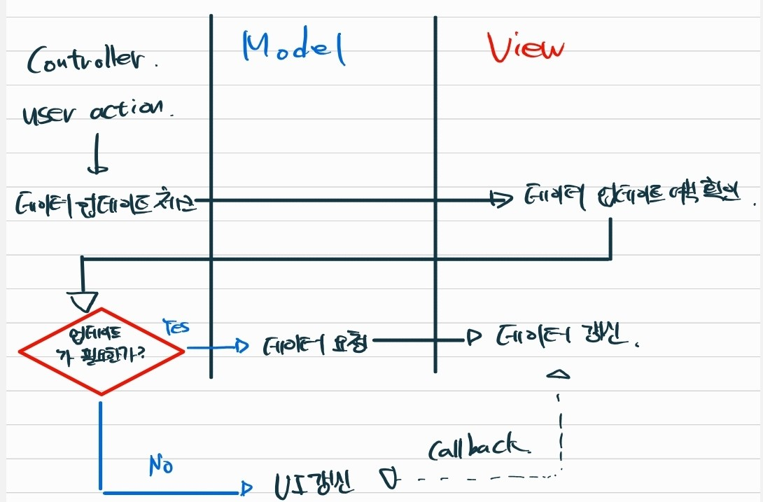 - 데이터 업데이트가 필요한 경우 데이터를 요청하며 데이터를 갱신하고 필요에 따라 View에 UI 갱신요구를 해서 View가 UI를 갱신합니다.