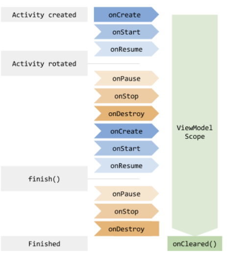 위 그림과 같이 Activity가 생성되고, 다양한 생명주기를 갖게 되지만 그때 동안, ViewModel은 종료되지 않고 쭉 살아있게 됩니다. 화면회전과 같은 상황에서 Activity가 재생성되더라도, ViewModel을 사용하면 데이터를 유지할 수 있습니다.