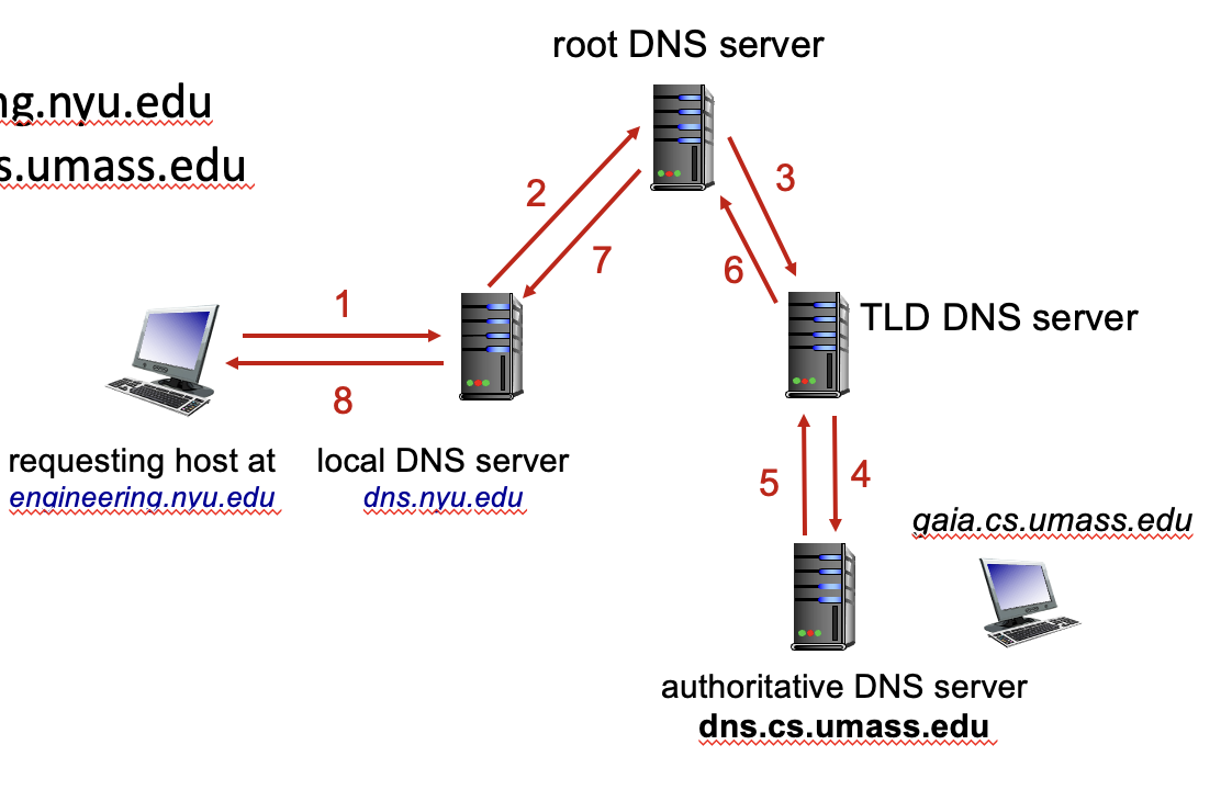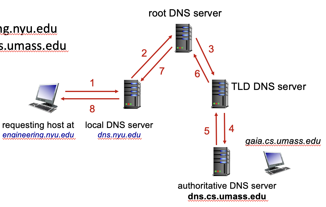 - Local DNS 서버는 umass.edu에 해당하는 DNS 서버에게 쿼리를 날리고, 해당 DNS 서버는 gaia.cs.umass.edu에 해당하는 IP 주소를 알려준다. 즉, umass.edu를 책임지는 DNS 서버가 authoritative name 서버인 것이다.