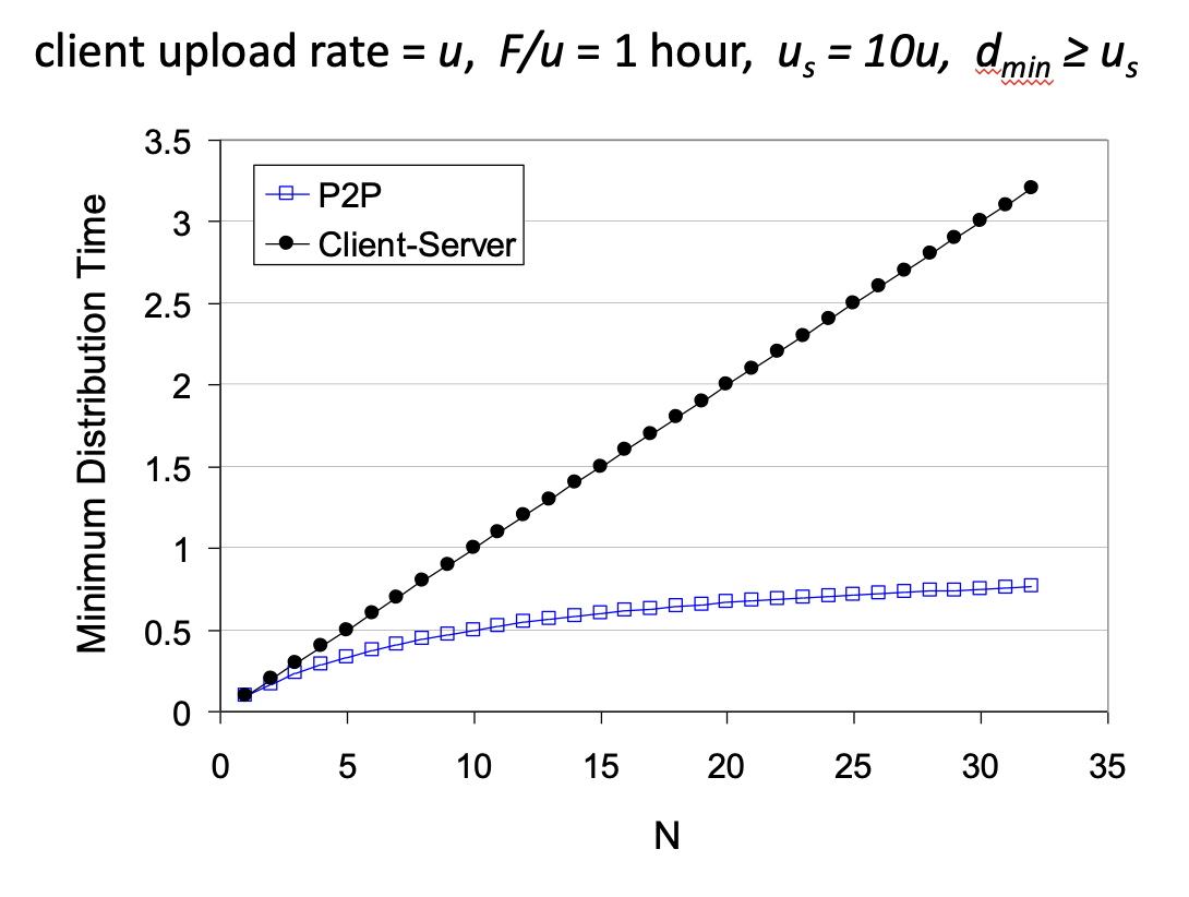 따라서 N이 증가할수록 P2P 모델은 시간이 줄어드는 반면, 클라이언트-서버 모델은 시간이 일정한 것을 알 수 있다.