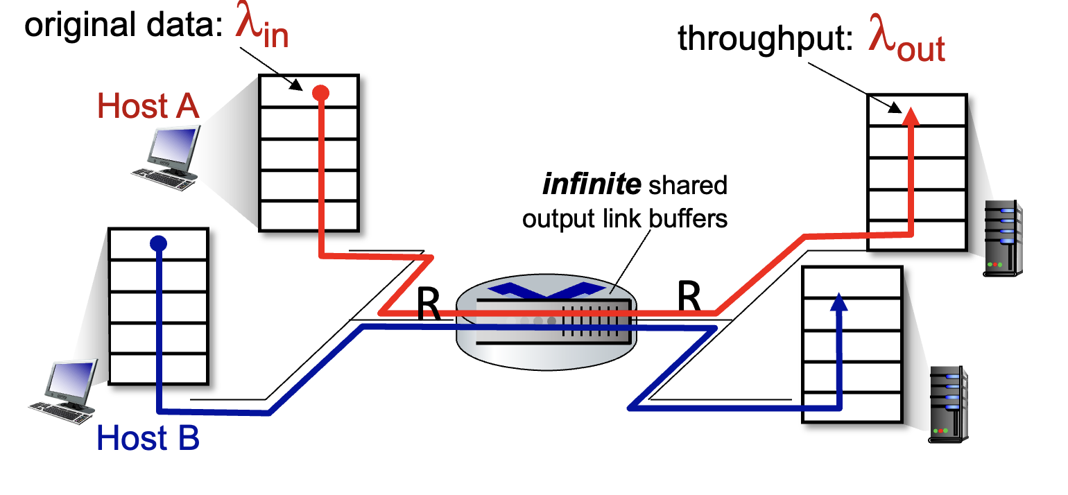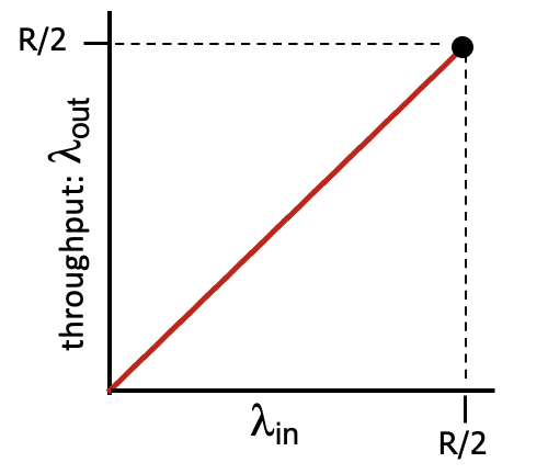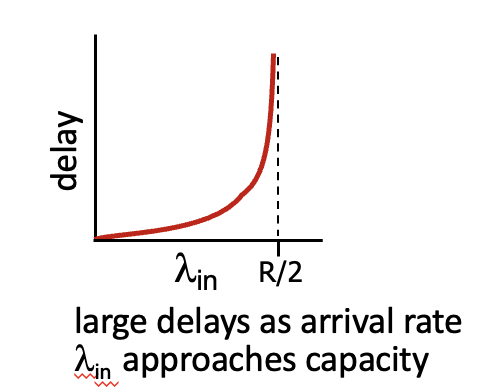 위 그림은 송신 transmission이 R/2에 가까워질수록 Queing delay 때문에 지연시간이 증가하는 것을 알 수 있다.