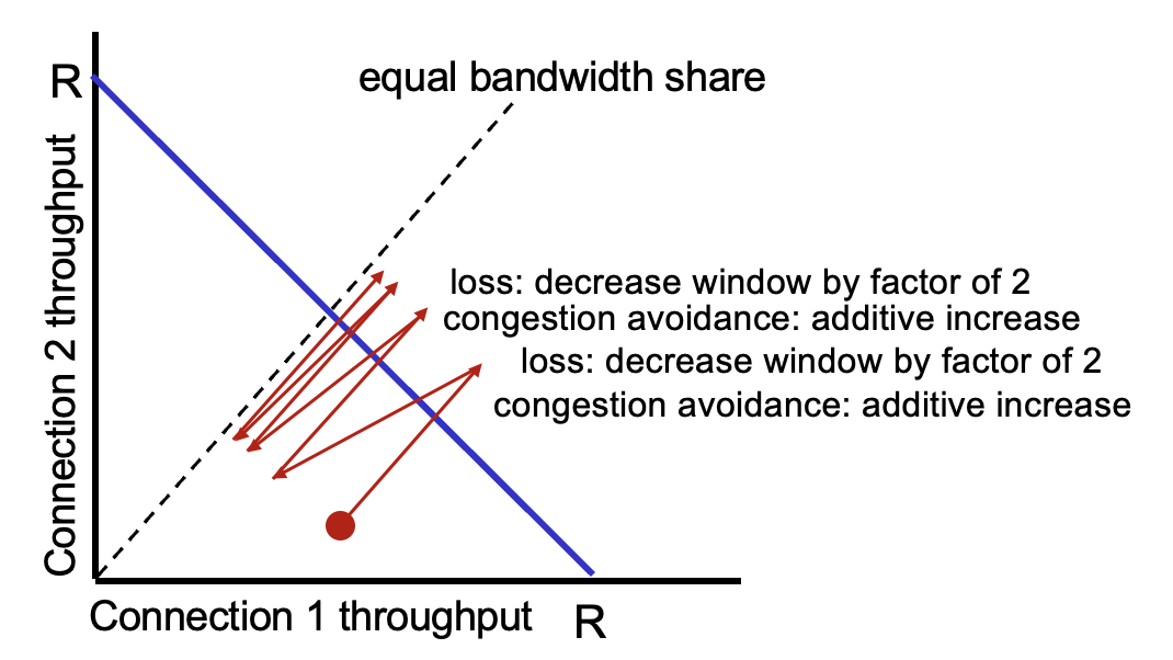 AIMD 알고리즘은 모든 호스트가 공평하게 네트워크를 사용하게 된다.