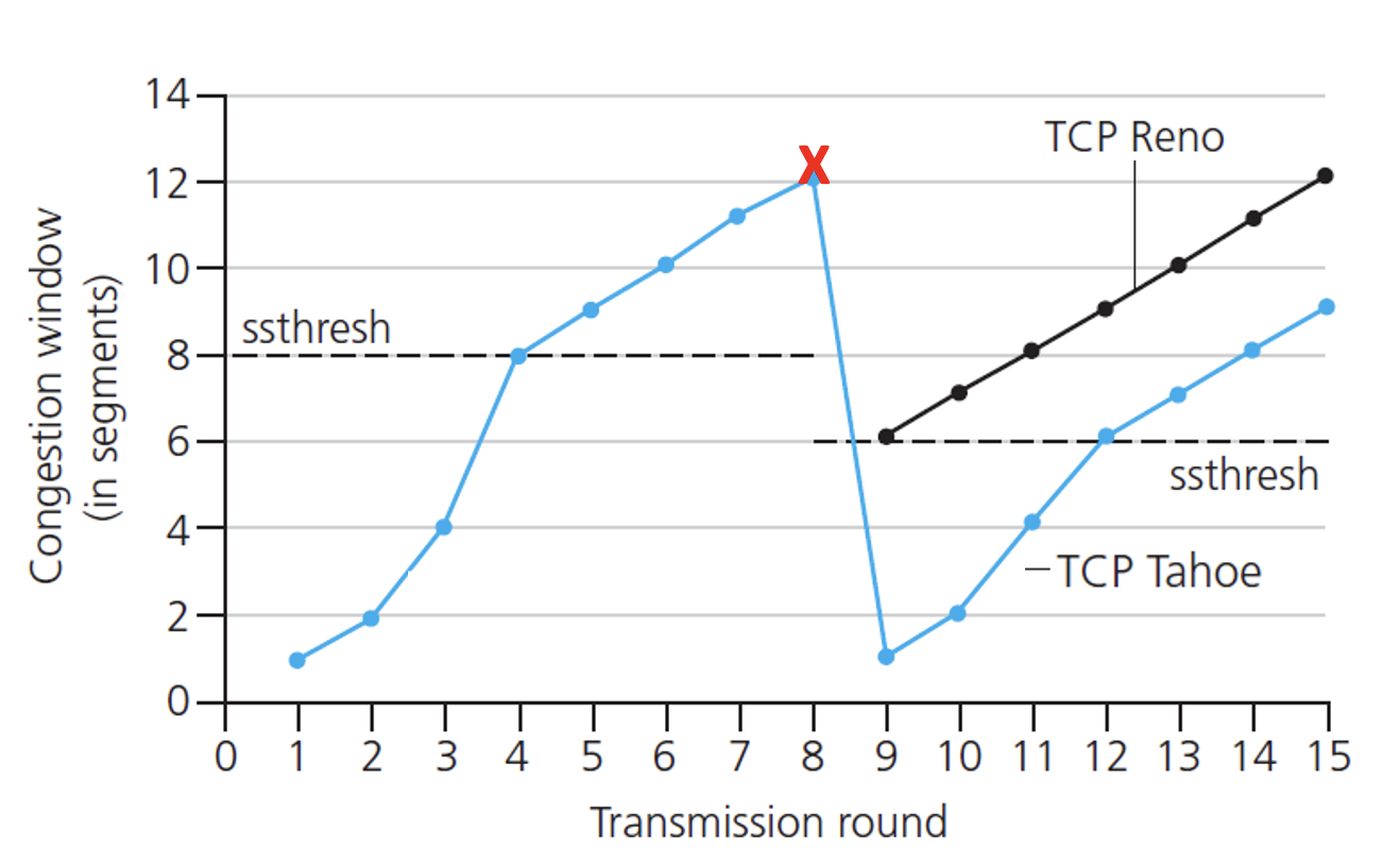 - TCP Reno는 2가지 상황에 대해서 구별 대응한다.