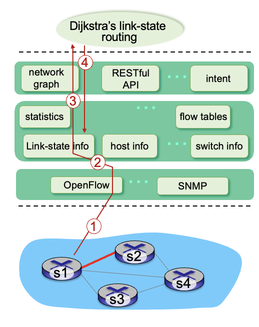- 링크 상태 라우팅 app는 SDN 컨트롤러의 플로우 테이블 계산 구성요소와 상호작용해서 새로운 플로우 테이블을 계산한다.