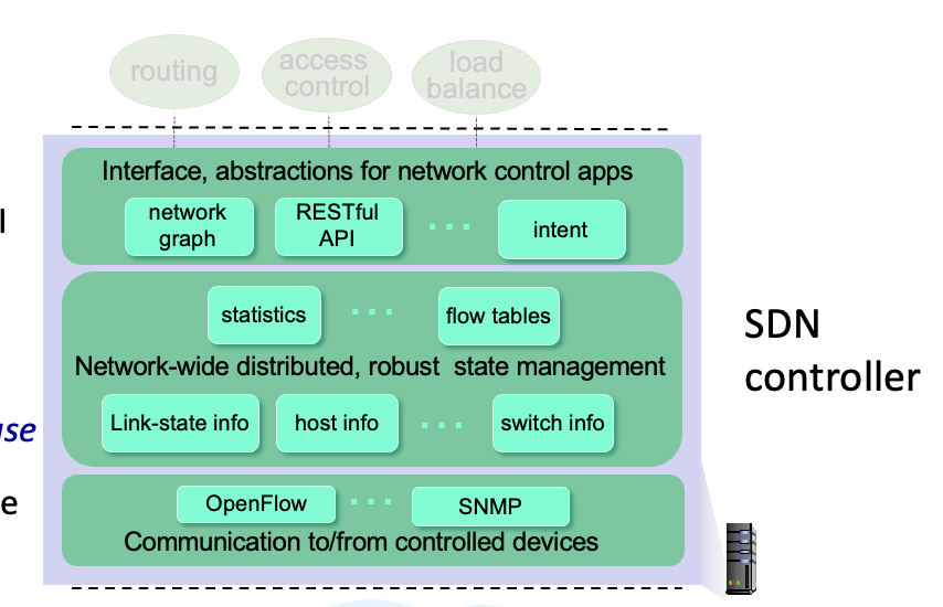 3) 네트워크 제어 기능이 data plane switch 외부에 존재 4) 라우팅을 프로그래밍 가능케 한다. - SDN은 아래에서부터 data-plane switches, SDN controller, network-control application으로 구성되어 있다.