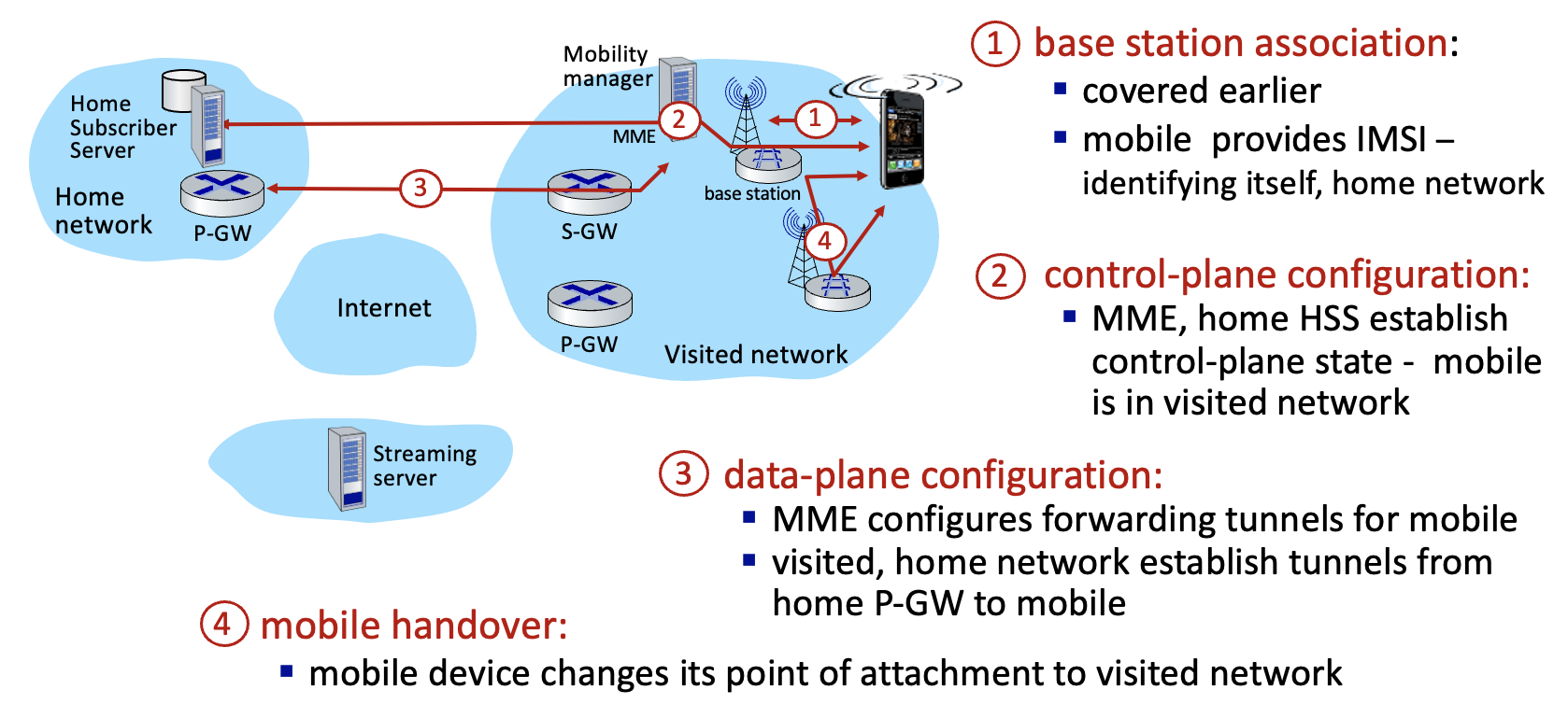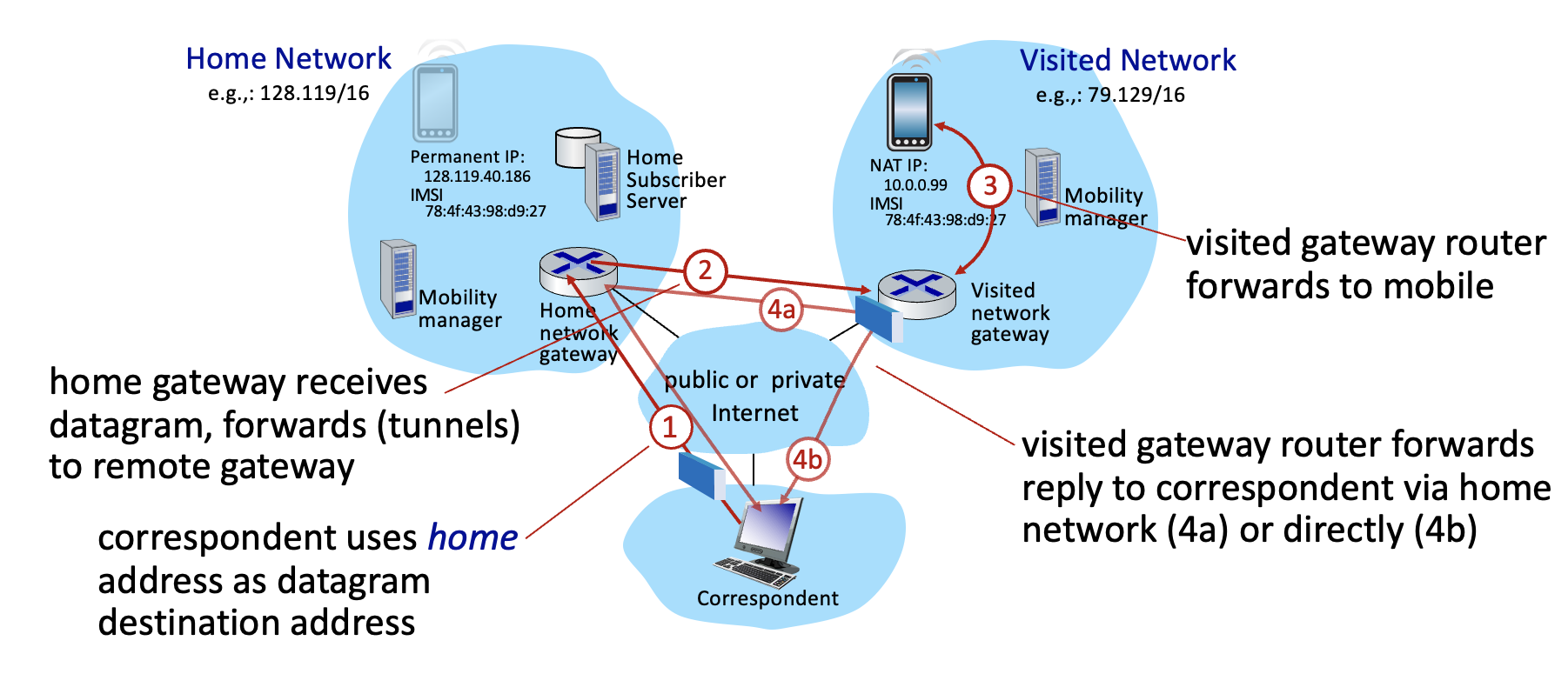 - tunneling via GTP(GRPS tunneling protocol) : 모바일 기기의 데이터그램을 GTP를 이용해 UDP datagram 안에 캡슐화된다.