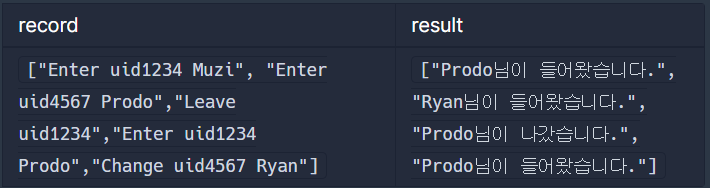 채팅방에 들어오고 나가거나, 닉네임을 변경한 기록이 담긴 문자열 배열 record가 매개변수로 주어질 때, 모든 기록이 처리된 후, 최종적으로 방을 개설한 사람이 보게 되는 메시지를 문자열 배열 형태로 return 하도록 solution 함수를 완성하라.