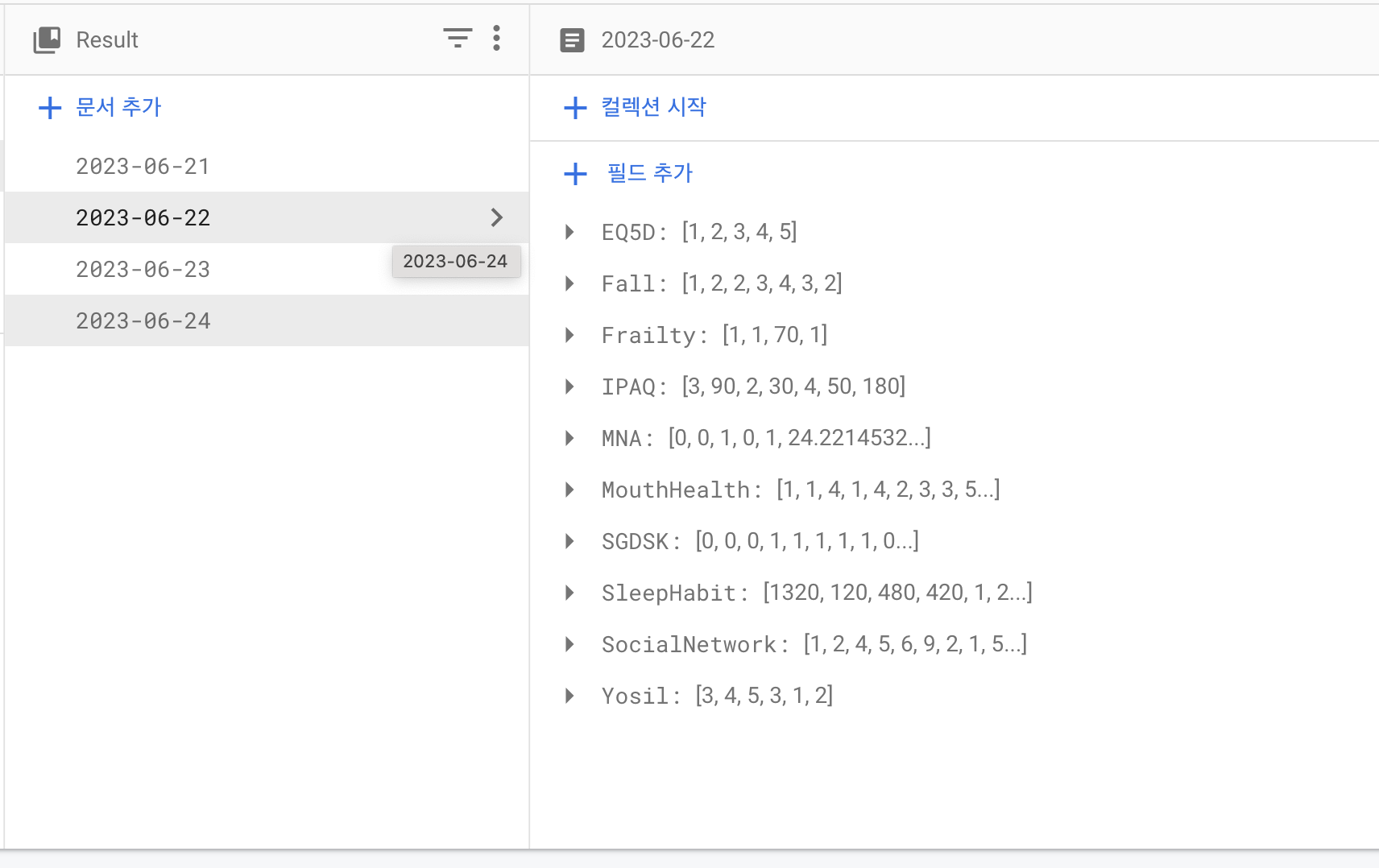 사용자의 개인적 특성과 날짜에 대한 설문조사 결과를 firestore를 통해서 구현했습니다.