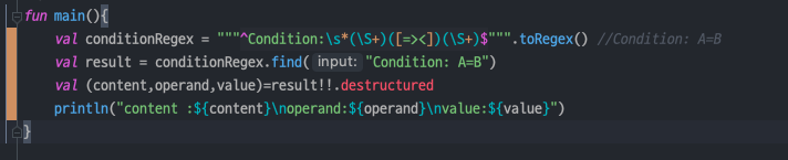 val conditionRegex = """^Condition:\s*(\S+)([=><])(\S+)$""".toRegex() //Condition: A=B