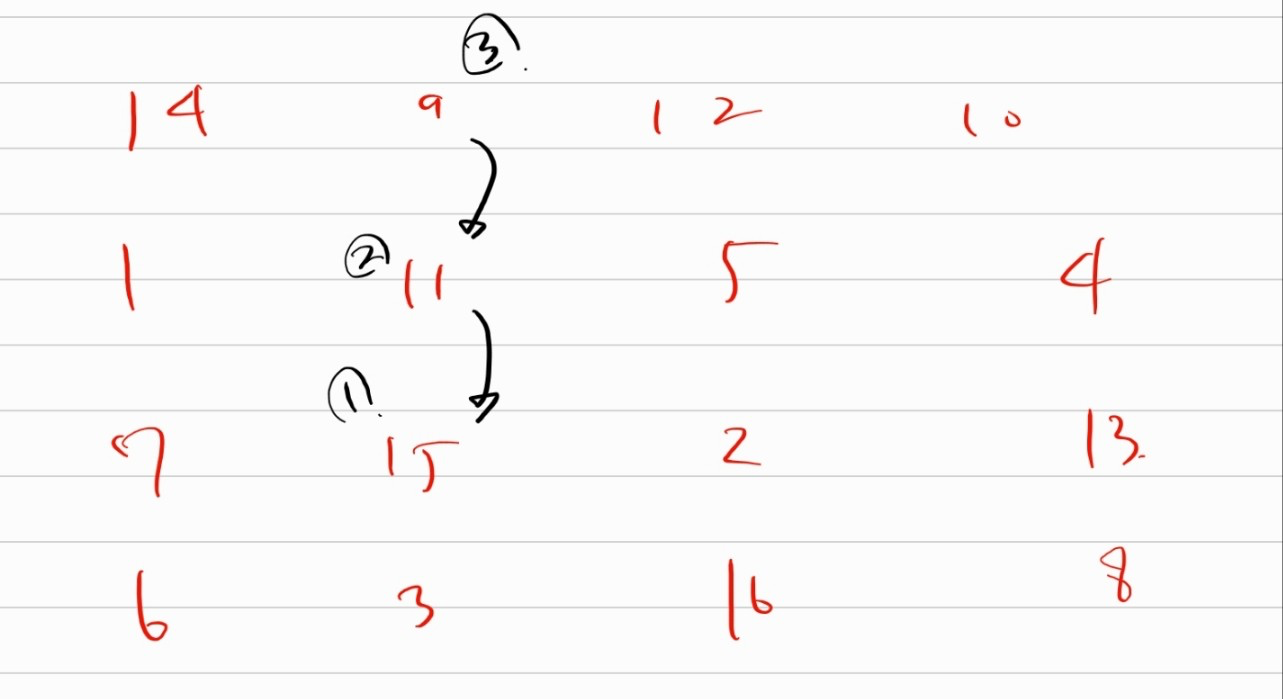 처음 탐색에서 아래방향으로 탐색을 한다고 가정할 시 , 끝까지 탐색을 하고 9에는 3이, 11에는 2가, 15에는 1이 저장될 것이다.