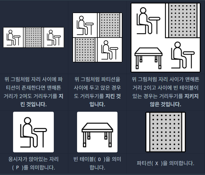 - 만약 같은 열에 위치한다면 A와 B 사이 행에 파티션이 있으면 거리두기를 지키는 것이다.