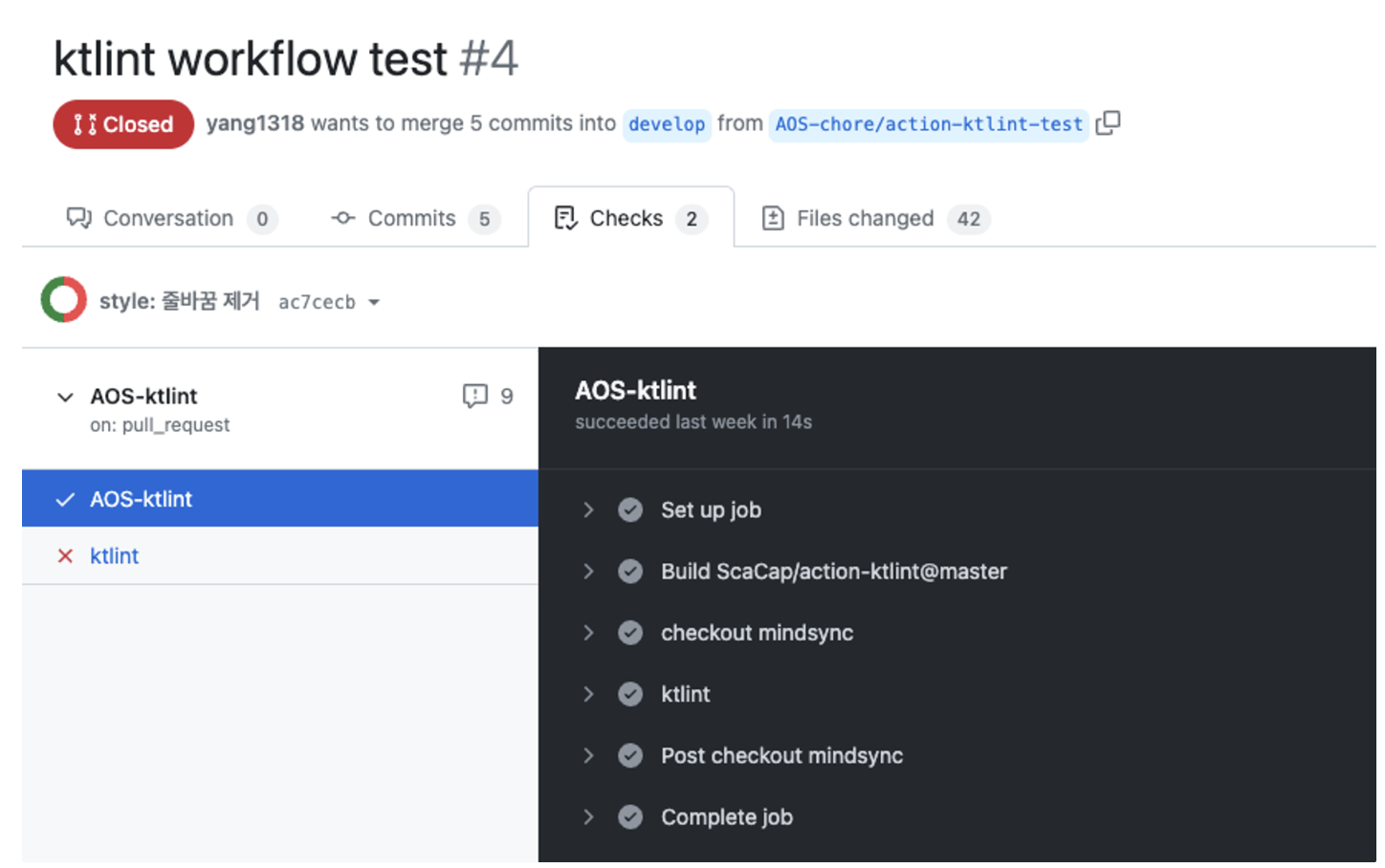 위 코드에선 PR을 main과 AOS-develop에 보내면 ktlint Check를 하거나, 확장자가 kt 파일인 경우 ktlint 검사를 한다.